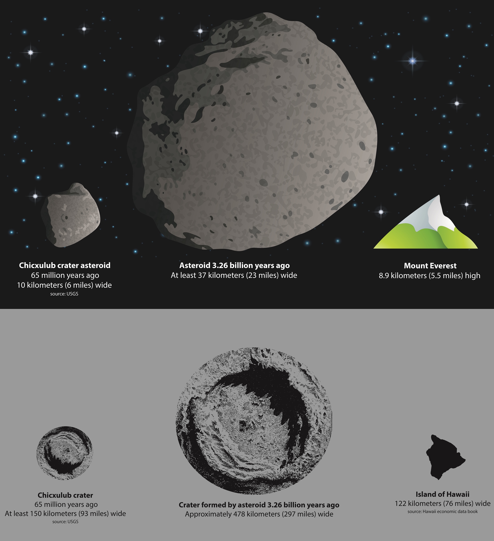 Based on the thickness of the layer, the impactor has been estimated as between 37 and 55 km in diameter. This is considerably larger than then the KT event. The impact caused dikes to form in the Onverwacht group. Some of the spherules found their way into these dikes, suggesting they were still open when the rock rain arrived. Gradation of the spherules suggests passing tsunami waves. The area was still deep under water, but this did not protect against currents caused by the tsunamis, or the earthquakes. The moment of the earthquakes has been estimated at a minimum of M10.8. A crater of some 500 km across may have formed. However, this would have been on Archean oceanic crust of which little survives, thousands of kilometers away from the Barberton rocks.