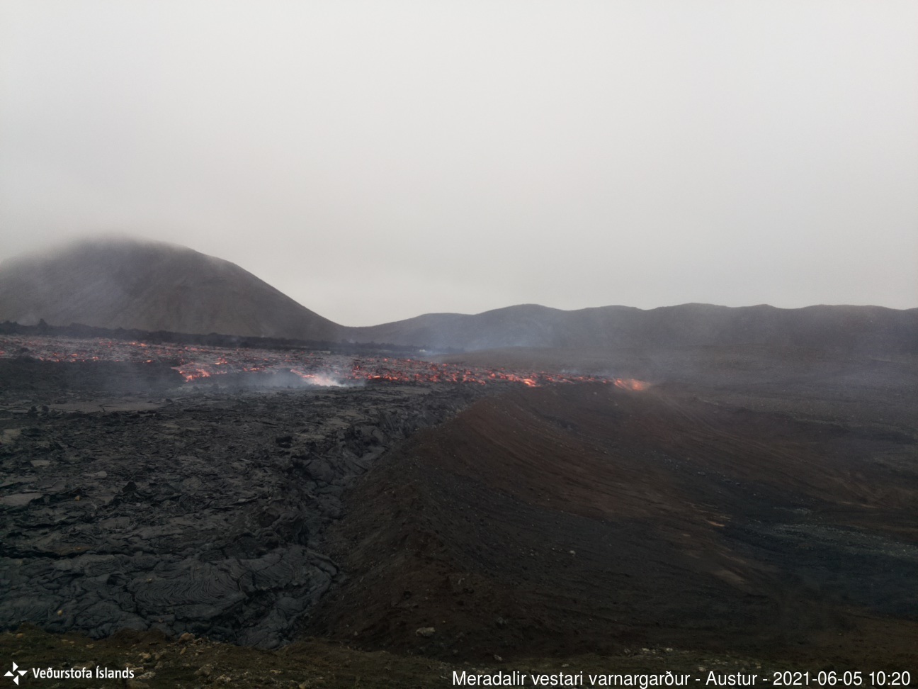 At 19.30 (4p min ago) it is possible to see the lava flow over the saddle from Gelingadalir.