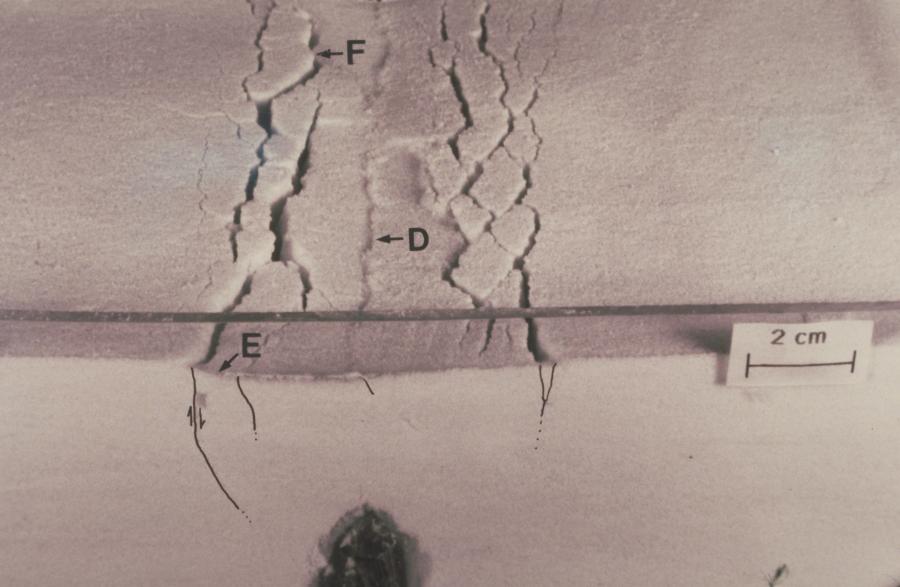 An experiment showing how ground cracking takes place due to the intrusion of magma. The black material at the bottom would represent the dyke. From USGS, Mastin, L.G., and Pollard, D.D., 1988, Surface deformation and shallow dyke intrusion processes at Inyo Craters, Long Valley, California: Journal of Geophysical Research, v. 93, no. B11, pp. 13,221-13,235.